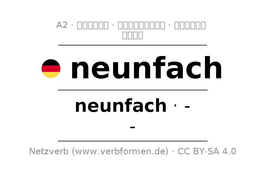 neunfach विशेषण का रूपांतरण (नौगुणा, नौ गुना) अपरिवर्तनीय रूप neunfach के माध्यम से होता है। इस विशेषण के लिए तुलनात्मक और सर्वोच्च रूप नहीं होते। neunfach विशेषण का प्रयोग संज्ञा के पहले (विशेषण रूप में) और क्रिया के साथ (वाच्य रूप में) दोनों तरह से किया जा सकता है।यहाँ आप न केवल neunfach को रूपांतरित और तुलना कर सकते हैं, बल्कि सभी जर्मन विशेषणों को भी। टिप्पणियाँ ☆